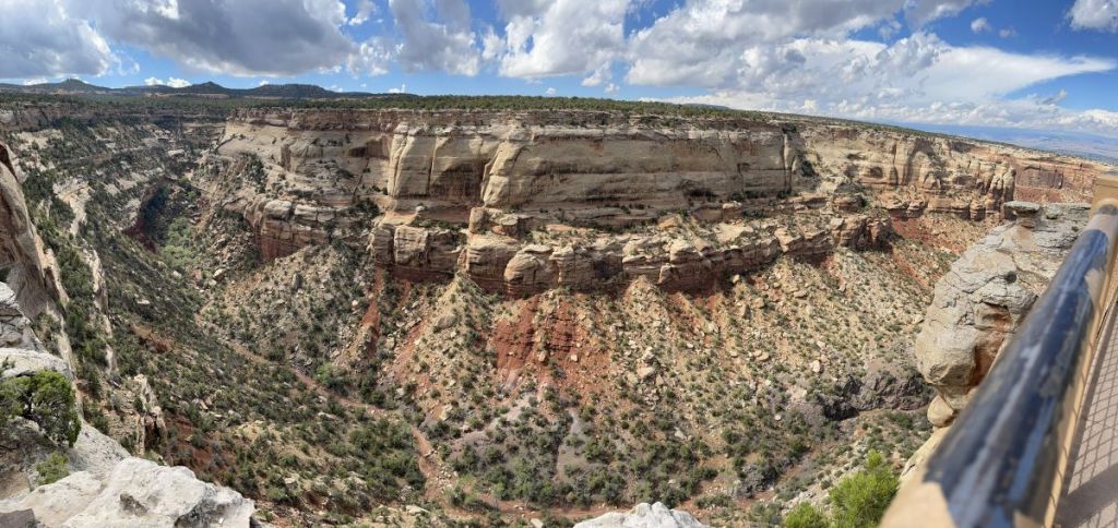 Upper Ute Canyon Overlook. Not wheelchair accessible. Not recommended for those with limited mobility. There are about 12 steps down from the parking area to the first overlook and a trail of about 100 yards to the overlook at the edge of the canyon.
